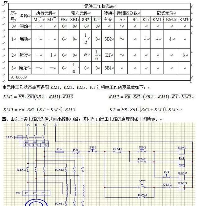 三、控制電路要做到KM1、KM2、KM3有序地投入和切除,就要做好控制電路的轉(zhuǎn)換順序。要用到的元件有:?jiǎn)?dòng)按鈕一個(gè);停止按鈕一個(gè);接觸器KM1、KM2、KM3三個(gè);延時(shí)用的時(shí)間繼電器一個(gè);電機(jī)過(guò)流熱敏繼電器一個(gè)??刂齐娐返墓ぷ鞒绦蛴兴牟剑涸紶顟B(tài);啟動(dòng)狀態(tài);運(yùn)行狀態(tài);停止?fàn)顟B(tài)。由此可得到如下的元件工作狀態(tài)表如下表所示。